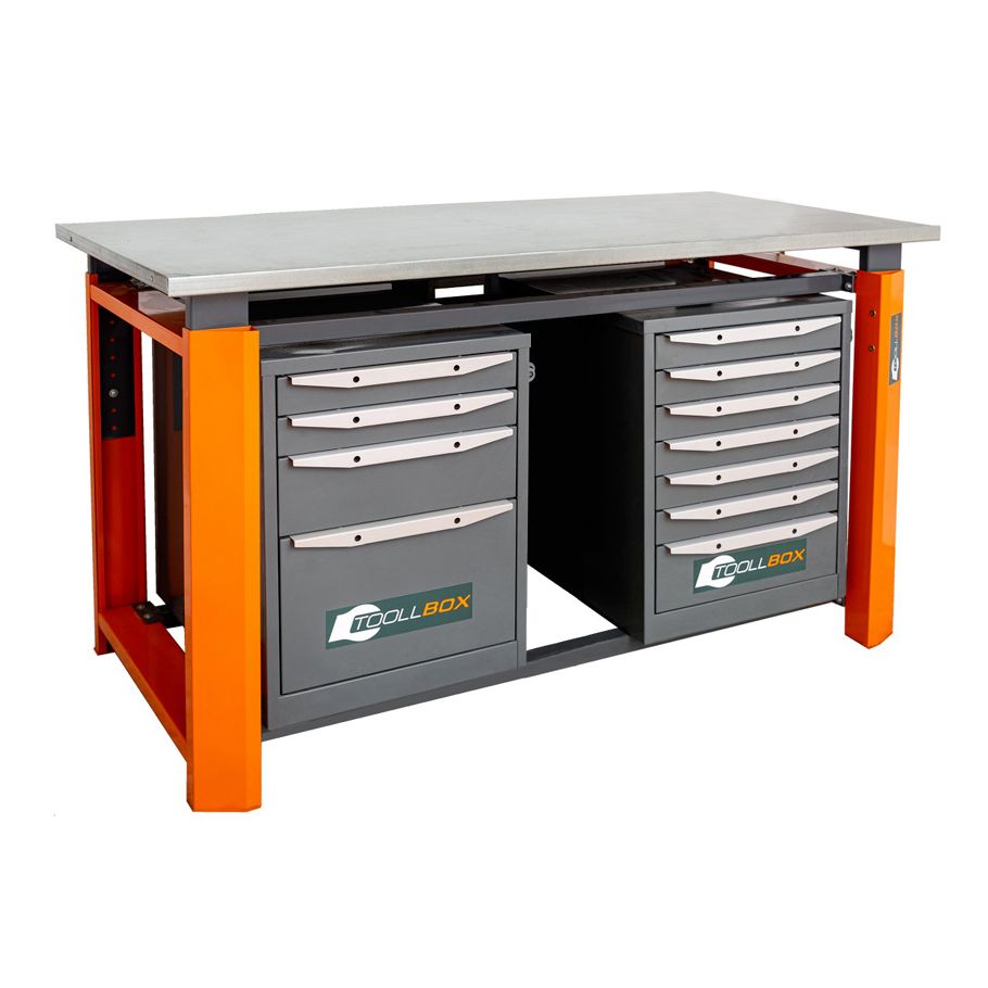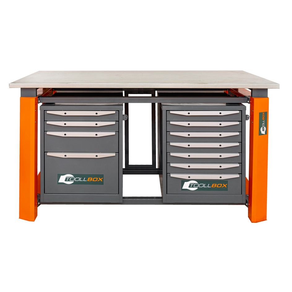 Верстак ТВР1800 (ТВ4-ТВ7) — вместительное и основательное рабочее место для мастерской, сервисной зоны или производственного участка, где важны порядок, запас прочности и удобный доступ к инструменту. Эта модель выполнена в двухтумбовом комбинированном формате: с одной стороны установлена тумба с четырьмя выдвижными ящиками, с другой — тумба с семью ящиками. Такое решение позволяет грамотно распределить оснастку, крепеж, ручной инструмент и расходные материалы, не загромождая рабочую поверхность.